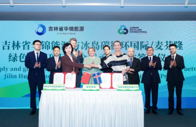 10月16日,正值冰島總統(tǒng)哈德拉?托馬斯多蒂爾訪華期間,2025可持續(xù)全球領(lǐng)導(dǎo)者大會(huì)在上海召開(kāi),大會(huì)主題活動(dòng)——中國(guó)-冰島企業(yè)合作簽約儀式同期舉行,冰島總統(tǒng)哈德拉?托馬斯多蒂爾親臨現(xiàn)場(chǎng)。會(huì)上,吉林省華錦能源有限公司與冰島碳循環(huán)國(guó)際(CRI)/麥芬隆完成綠色甲醇項(xiàng)目暨全球承購(gòu)合作簽約;中環(huán)新能源控股集團(tuán)旗下中環(huán)新能源創(chuàng)新研究院有限公司,與吉林省華錦能源有限公司簽署戰(zhàn)略合作協(xié)議。