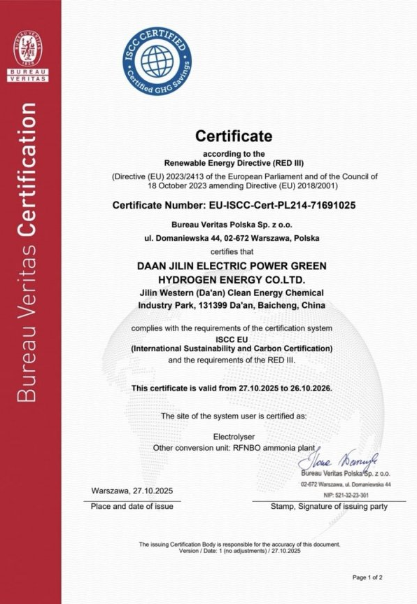 10月27日,吉電股份大安風(fēng)光制綠氫合成氨一體化示范項(xiàng)目(一期)“氫洲·綠氨”獲得全球首張“ISCC EU RFNBO Ammonia”(可再生燃料非生物來源氨)認(rèn)證證書,這是國家電投集團(tuán)貫徹落實(shí)黨的二十屆四中全會(huì)精神的實(shí)踐成果,也標(biāo)志著該集團(tuán)綠色氫基能源產(chǎn)業(yè)實(shí)現(xiàn)了新突破。