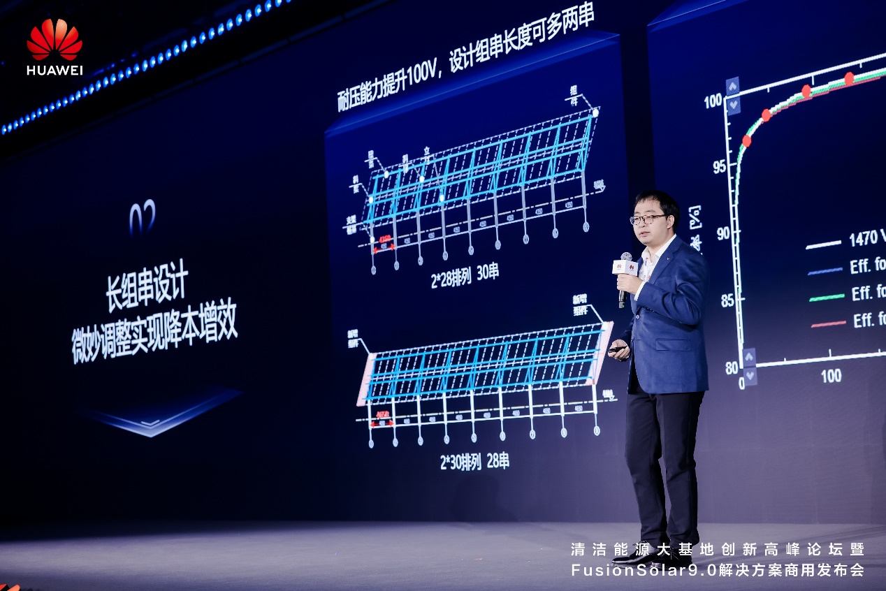內(nèi)蒙古華能庫布齊能源有限公司潘禹分享了沙戈荒光伏大基地技術創(chuàng)新與實踐,華為數(shù)字能源與中國華能集團北方聯(lián)合電力有限責任公司、中國華能集團清潔能源技術研究院有限公司、內(nèi)蒙古華能庫布齊能源有限公司聯(lián)合開展了大功率逆變器的驗證與應用,探索清潔能源基地長組串、大子陣設計,持續(xù)降低系統(tǒng)BOS、提升收益,測試期間數(shù)據(jù)顯示,新方案可提升約1%發(fā)電量,未來華為數(shù)字能源與華能還將持續(xù)探索清潔能源大基地先進技術應用。