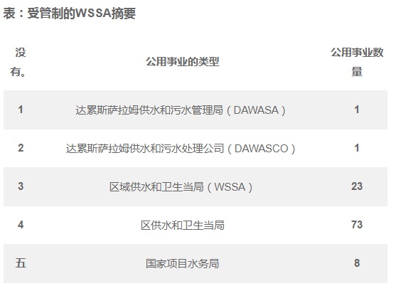 目前,EWURA管理130個供水和衛(wèi)生當(dāng)局,為區(qū)域和地區(qū)總部,小城鎮(zhèn)和國家項目水務(wù)局提供供水和衛(wèi)生服務(wù),如負(fù)責(zé)水資源部長宣布的受管制WSSA列表所示, 并總結(jié)如下。