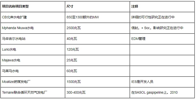 兩個直接項目是Cahora Bassa大壩和有爭議的Mphanda Nkuwa大壩(2500兆瓦)的850兆瓦(名義)擴(kuò)建。見下表。