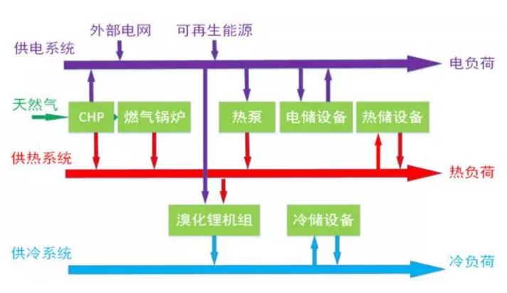 橫向來看依次是源網(wǎng)荷儲。源側(cè)包括常規(guī)的供電設(shè)備、CHP機(jī)組、燃?xì)忮仩t等設(shè)備,以及外部電網(wǎng)供電、可再生能源接入;網(wǎng)架分為冷熱電等傳輸系統(tǒng);荷側(cè)為園區(qū)內(nèi)部的電、熱、冷負(fù)荷;在儲能方面,不同能源子系統(tǒng)均有各自的儲能設(shè)備??v向來看依次是電、氣、熱、冷多能互補(bǔ)運(yùn)行。不同的能源子系統(tǒng)分別用不同的顏色表示,多種能源轉(zhuǎn)化設(shè)備(熱泵、CHP、燃?xì)忮仩t、溴化鋰機(jī)組)將不同的能源子系統(tǒng)相耦合。園區(qū)內(nèi)部多種能源形式以虛擬電廠的形式組合在一起綜合運(yùn)行,在保證電、熱、冷負(fù)荷可靠供應(yīng)的前提下,實(shí)現(xiàn)了能源的梯級利用,提高能效,降低用能成本。并且對于波動性很強(qiáng)的可再生能源而言,綜合能源系統(tǒng)具有更多的靈活性,促進(jìn)了可再生能源的接納,進(jìn)一步提高系統(tǒng)經(jīng)濟(jì)性。