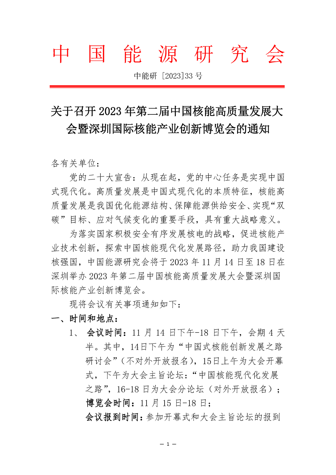 關(guān)于召開2023年第二屆中國(guó)核能高質(zhì)量發(fā)展大會(huì)暨深圳國(guó)際核能產(chǎn)業(yè)創(chuàng)新博覽會(huì)的通知